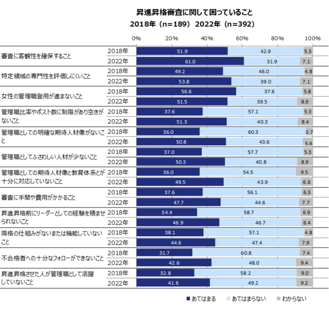 ・また、ほとんどの項目について“困っていること”として挙げられる割合が増加しています。昇進昇格審査への問題意識自体が高まっていると考えられます。