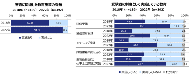・一方で2018年との比較でみると、最も実施率が増えたのは、「eラーニング受講61.0%(+40.9ポイント)」です。それ以外に、「通信教育50.8%(+25.4)」「課題図書の読み込み42.3(+23.3%)」も増えていることから考えると、昇進昇格審査前に受験者が学ぶ機会を設定している企業が増えているといえます。