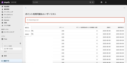 今回のリニューアルでは、Shopifyの管理画面に近いデザインが採用されていて、より見やすく、操作も直感的になりました。また、待望だったユーザーやポイント履歴の検索機能が追加されていたのですが、ステータスやポイント数で絞り込みできる点が期待以上で大変嬉しいです。このデータをエクスポートできるようになるのが今後の期待です。