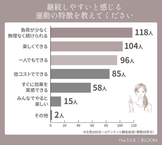 今回の調査では、女性200名に「継続しやすいと感じる運動の特徴」についてアンケートを実施しました。