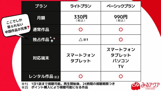 これまでの「みるアジア」は、独占作品で扱っているようなアジア諸国の文化や歴史などを扱った重厚な作品を好むコアなユーザーが大半を占めておりましたが、今回、重厚な作品以外を好むライトユーザーに向けて、ポピュラーな作品を手軽に低価格で楽しんでいただける”ライトプラン”をご用意しました。