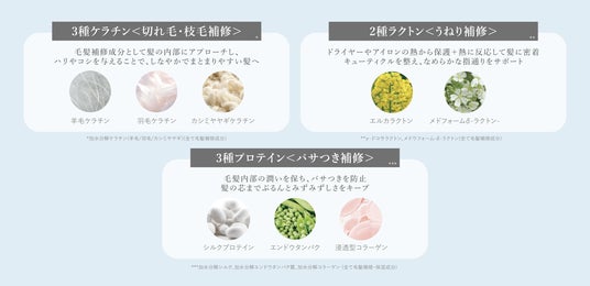 *1 加水分解ケラチン(羊毛/羽毛/カシミヤヤギ)(全て毛髪補修成分)、*2 γ-ドコサラクトン、メドウフォーム-δ-ラクトン(全て毛髪補修成分) 、*3 加水分解シルク、加水分解エンドウタンパク、 加水分解コラーゲン (全て保湿成分)