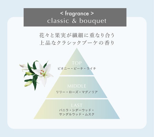 「Promille」の定番アイテムであるヘア&ボディオイル『プロミルオイル』と同じ、クラシックブーケの香りを採用。花々と果実が重なる穏やかな香りが、バスルームにふんわりと広がります。