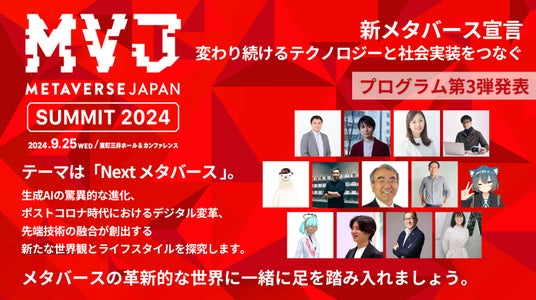 一般社団法人Metaverse Japan(代表理事:長田新子、馬渕邦美、以下MVJ)は、「Next メタバース 」をテーマに掲げ、「Metaverse Japan Summit 2024」を9月25日(水)に室町三井ホール&カンファレンスで開催します。このたびプログラムと登壇者の第3弾を公開しました。