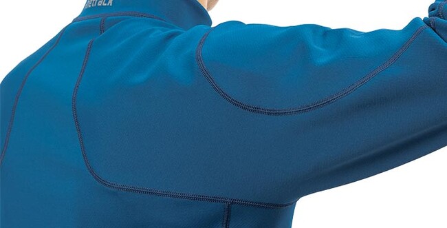 身体の動きに合わせた立体デザインとストレッチ性で、沢登りやパドリングなど大きな動きでもストレスの少ない動きやすさを実現しています。また、縫製箇所は可動部からずらしてフラットシーマを採用することで、水に濡れた時でも肌へのストレスを軽減します。