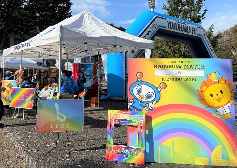 当日は、レインボーフォトパネルの設置、レインボーグッズの配布、スタジアムグルメの販売をし、
