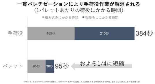 JPRは、実際の物流現場で収集したデータから、パレット輸送による荷役作業の短縮効果を数値化しています。その結果によれば、手荷役での積み下ろしをパレットに変更することで、荷物の積み下ろしにかかる時間は、1パレットあたり384秒から95秒へと、289秒短くなります。