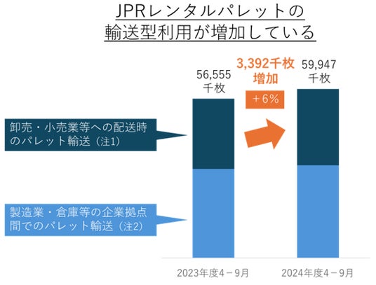 JPRが提供するレンタルパレットを活用した輸送が増加しています。トラックドライバーの労働時間に上限が設定された2024年4月以降、商品輸送等に使われたJPRレンタルパレットは、前年比約6%、約3,392千枚増加しました。(2024年4-9月と前年同期間の比較)