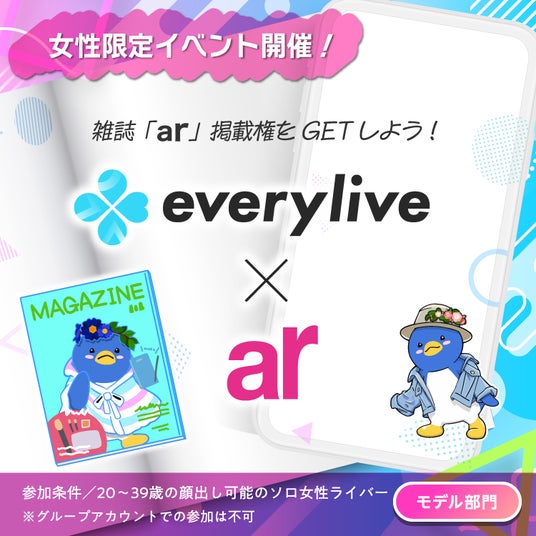 エブリライブ株式会社(本社:東京都港区、代表取締役:影山和義、URL:https://everylive.jp/)が運営するライブ配信アプリ「everylive(エブリライブ)」は、2025年1月6日(月)から2025年1月22日(水)まで、雑誌「ar」に掲載されるエブリライブ広告への出演権利がプライズのイベント「雑誌「ar」掲載権をGETしよう!」を開催します。