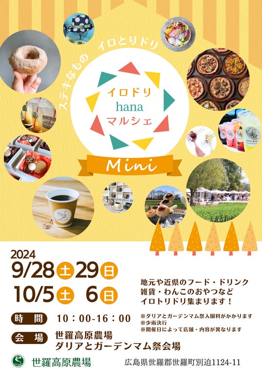 イロドリhanaマルシェmini地元世羅や近隣のグルメ、雑貨、ワークショップが集まります。ペットの撮影会(5日のみ)や犬用おやつの販売などもあります。ご家族みなさんでお越しください。