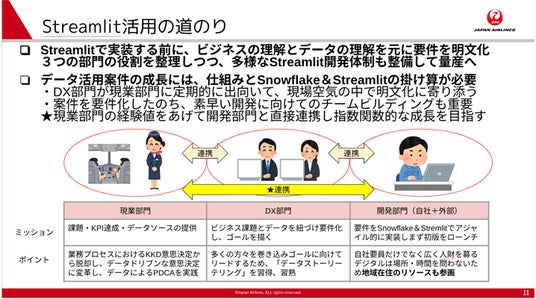 庄司氏は現場の協力のもと、課題解決に必要な社内外データを特定・収集・蓄積し、メタデータ整備でデータ内容を誰でも理解できるようにすることを目指しました。Streamlitアプリの作成は3ヶ月をワンタームとした反復開発で進め、本部KPIの可視化・予測や機内サービスデータ分析、空港でのフードロス予測などに取り組んでいます。これらは従来の分析を補完・拡張するものとして活用されています。
