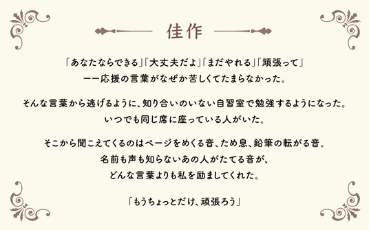 失意のとき、こんな力強い言葉をかけてくれるご両親の存在に感銘を受けました。きっとその一言が、悔しさや迷いを“前に進む力”へと変えてくれたことでしょう。再挑戦を決めたときにも、変わらず背中を押してくれたご両親への思い。これまで言葉にしきれなかった感謝の気持ちが、しっかりと伝わってくる作品でした。