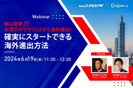 「企業の情報と印象をデザインする」をコンセプトに掲げ、メディアとWEBとオフラインを融合させたマーケティング戦略を提供する、株式会社アナログPR(本社:東京都港区、代表取締役:松浦啓介)は、2024年6月19日(水)に、メディア事業やファンマーケティング事業を通して、子育て支援を行う株式会社エンファム.(本社:福岡県福岡市、代表取締役:森光太郎)と、企業の海外進出に向けたウェビナーを共同開催することをお知らせいたします。
