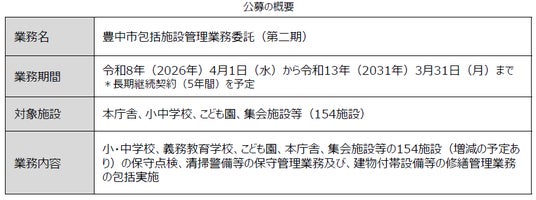 豊中市では、公共施設管理業務の効率化と質の向上を図ることを目的とした包括施設管理業務委託を導入しており、令和8年3月31日をもって第一期が終了します。これにより、豊中市包括施設管理業務委託(第二期)事業を継続して実施するため、広く公募します。