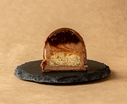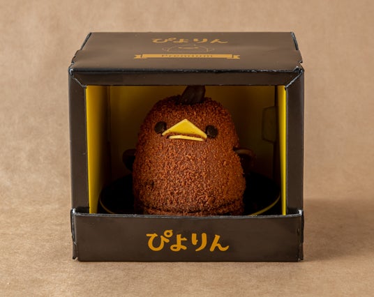 名古屋コーチンの卵と厳選バニラビーンズを使用した風味豊かなプリンを中南米産チョコレートのババロアで包み、溶け出すキャラメルを加えました。土台のガトーショコラには、くるみ、ヘーゼルナッツ、カカオニブを加え、ぴよりんのやわらかさと対象的なザクザク食感も楽しめます。ぴよりんの絵柄のついた有田焼のお皿にのせた、アムール限定特別仕様のぴよりんです。