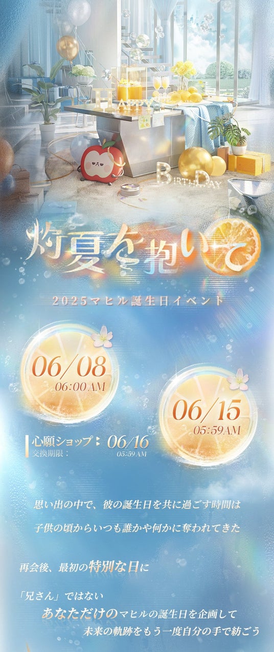 INFOLD PTE. LTD.は、全世界ユーザー数が5000万人を突破した恋愛シミュレーションゲーム『恋と深空』において、6月8日(日)6時よりマヒル誕生日イベント「灼夏を抱いて」を開催することをお知らせいたします。