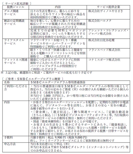 株式会社三井住友銀行(頭取CEO:福留 朗裕、以下「三井住友銀行」)は、2021年4月から開始した「SMBCエルダープログラム」において、2024年11月1日よりサービスを拡充いたします。 開始 以来、多くのお客さまにご好評をいただいておりますが、お客さまのより豊かな生活の実現に向けて、「生きがい」「楽しみ」「健康」をテーマに新たに7社の企業と提携いたします。