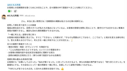 - 中小企業の持続的成長を支援 - 単なる業務効率化を超え、社員の働きがいや心の支えとしても機能し、企業独自の競争優位性を保ちながら持続的成長を支援する「理念を生きた判断基準に変える」AIパートナーです。