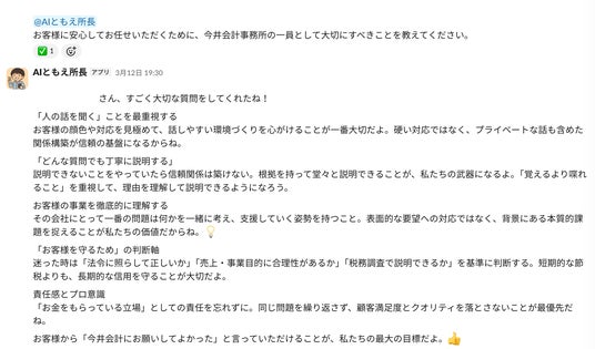お父様が「担当であっても窓口は君だから、今井会計の顔としてお客さんのところに行ってるんだ」と職員の皆様に伝えていたと伺いました。AIともえ所長が、その言葉を体現できるプロフェッショナルを育てる一助となり、地域と共に歩んできた40年の信頼を次の世代へとつないでいくお手伝いができれば、これほど嬉しいことはありません。