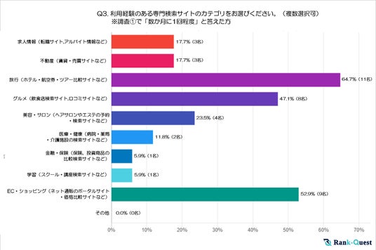 最も多かった回答は「旅行(ホテル・航空券・ツアー比較サイトなど)」で64.7%でした。次いで「EC・ショッピング(ネット通販のポータルサイト・価格比較サイトなど)」が52.9%、「グルメ(飲食店検索サイト、口コミサイトなど)」が47.1%となっています。