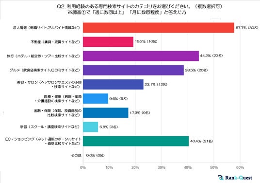 最も利用経験が多かったのは「求人情報(転職サイト、アルバイト情報など)」で57.7%でした。次いで「旅行(ホテル・航空券・ツアー比較サイトなど)」が44.2%、「EC・ショッピング(ネット通販のポータルサイト・価格比較サイトなど)」が40.4%、「グルメ(飲食店検索サイト、口コミサイトなど)」が38.5%と続いています。