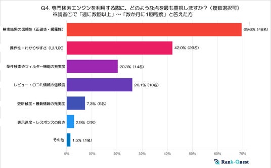 最も多かった回答は「検索結果の信頼性(正確さ・網羅性)」で69.6%でした。次いで、「操作性・わかりやすさ(UI/UX)」が42%、「レビュー・口コミ情報の信頼度」が26.1%、「条件検索やフィルター機能の充実度」が20.3%となっており、以下「更新頻度・最新情報の充実度」(7.3%)、「表示速度・レスポンスの良さ」(2.9%)、「その他」(1.5%)と続きます。