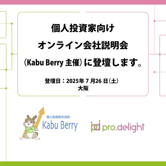 電話のDXを推進する株式会社プロディライト(大阪市中央区:代表取締役社長 小南 秀光、証券コード:5580、以下プロディライト)は2025年7月26日(土)、大阪で開催されるKabu Berry証券主催の個人投資家向けIRセミナーに登壇します。