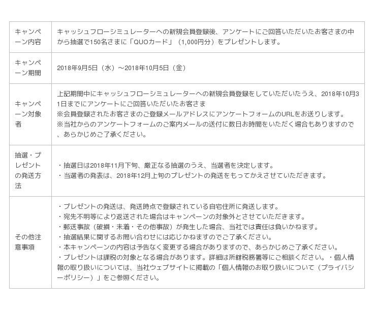 「キャッシュフローシミュレーター」に新規会員登録のうえ、アンケートにご回答いただいたお客さまの中から抽選で150名さまに「QUOカード」(1,000円分)をプレゼントします。