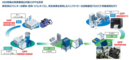 本PoCは、サトー製ラベルプリンターを対象に、使用済み製品の回収から解体・破砕、ABS樹脂の再生処理、さらに再生素材を用いたハンドラベラーの試験製造に至るまでの一連の工程にDPPを導入し、その運用方法および情報活用の有効性を検証するものです。