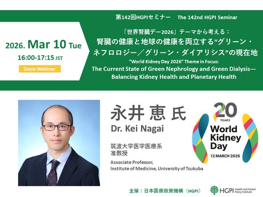 本セミナーでは、2026年の「世界腎臓デー(World Kidney Day)」のテーマである「すべての人の腎臓に健康を:人々のケアと地球の保護を両立する(Kidney Health For All - Caring for People, Protecting the Planet)」を軸に、腎疾患対策と「プラネタリーヘルス(地球規模の健康)」がいかに密接に関わっているか、そして医療現場から取り組むべき変革について、ライフサイクルアセスメント(LCA: Life Cycle Assessment)等の最新の研究データを交えて詳細にご講演いただきました。