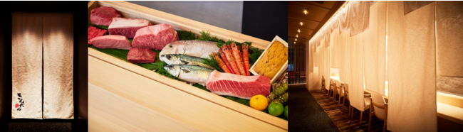 8メートルある木曽檜のカウンターは8席。新鮮な旬の海鮮と最高級和牛のネタを目で楽しんでいただけます。ゆったりとお寛ぎいただける完全個室は4部屋。個室では牛肉寿司の盛り合わせをご用意して、大切な方と極上の時間を提供いたします。