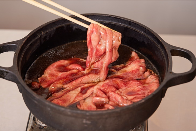 松阪牛は松阪肉牛協会が運営する「松阪牛個体識別管理システム」に登録された黒毛和牛の中でも、未経産の雌牛のみが“松阪牛”と呼称できる日本が世界に誇るブランド牛です。その松阪牛の上質な肩ロースを1枚ずつさっと火を通し、特製のすき焼きだれに絡ませて、お肉の旨味を最大限に引き出します。脂の融点が低いので、口に入れた瞬間にとろけるような食感をお楽しみいただけます。
