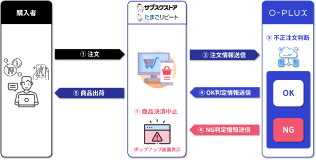今回、不正注文検知サービス「O-PLUX」がサブスクリプションコマースに特化したクラウド型通販システム「サブスクストア」及び「たまごリピート」と連携したことにより、同システムをご利用のお客様は、連携のためのシステム開発が不要となり、クレジットカードの不正利用対策や不正転売対策など、ネット通販における不正対策を短期間・低コストで利用可能となりました。
