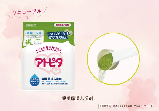 アトピタの入浴剤は、天然の生薬成分(ヨモギエキス)配合で、お肌にうるおいを与えながら、しっしん・荒れ性などの肌トラブルを防ぎます。お湯に浸かるだけで保湿ケアできるので、毎日のお風呂タイムにおすすめです。