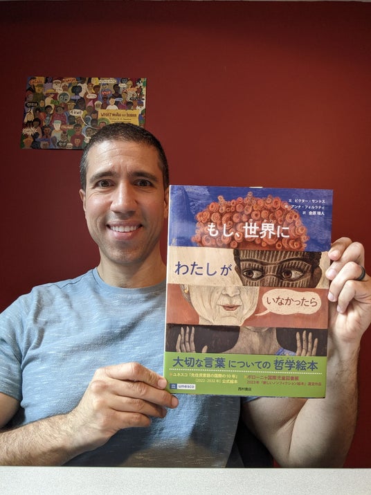 サントスさんのSNSより。完成した日本語版を手にニッコリ。児童書の作家、博士(言語学)。今までに6カ国で暮らし、10の言葉を学んできた。英語で書いた最初の作品『My Dad, My Rock』(未邦訳)は2022年のカーカス・ベストブックに選ばれた。ブラジル出身で、現在はアメリカのアイオワ州デモインに在住。ウクライナ人の妻との間にふたりの子どもがいる。ふたりはいくつもの言葉を話し、いくつもの文化を知っている。インスタグラム: @linguacious_llc/公式サイト: authorvictorsantos.com