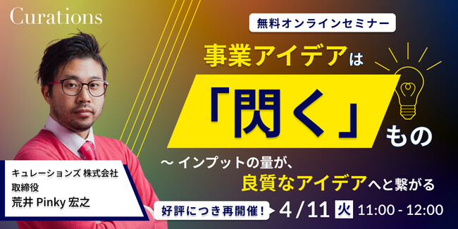 顧客企業のビジネス変革を成功に導くキュレーションズ株式会社(本社:東京都渋谷区、代表取締役社長:根本隆之、以下当社)は、『事業アイデアは「閃く」もの~インプットの量が、良質なアイデアへと繋がる』を2023年4月11日(火)に開催いたします。