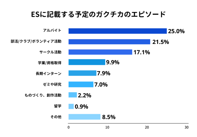 今回の調査では、ガクチカ(学生時代に力を入れたこと)のエピソードの上位3つは「アルバイト」(25.0%)、「部活/クラブ/ボランティア活動」(21.5%)、「サークル活動」(17.1%)ということがわかりました。