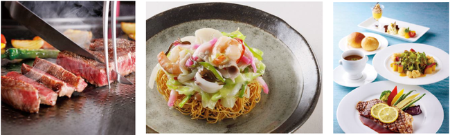 各レストランでは、鉄板焼「ときわ」での長崎和牛を使ったコースをはじめ、トップラウンジ「オリゾンテ」では、ハトシや大村寿司、ちゃんぽんなど長崎県の名物料理がラインアップしたブッフェ料理もご堪能いただけます。また、中国料理「桃李」の皿うどん、カフェ「レックコート」のレモンステーキなども提供しています。