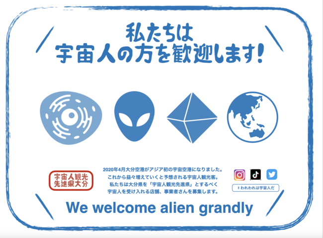 宇宙人観光推進委員会は、大分港がアジア初の宇宙港になることを受け、これから増える宇宙人観光を盛り上げるため「宇宙人観光先進県大分」を目指し発足しました。その第一弾プロジェクトとして、「宇宙人観光客歓迎店」の取り組みを実施。加盟店30店舗に専用ステッカーを配布し、その全ての店舗で宇宙人向け商品を販売しています。