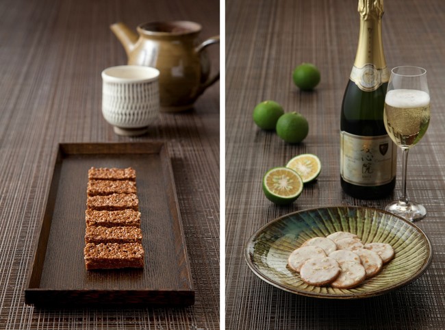 坐来大分のオリジナル商品として開発販売している「金ごまフロランタン」は、フランスの伝統的な焼き菓子「フロランタン」の坐来オリジナルバージョンです。ナッツの代わりに希少な大分県豊後大野市清川町産の金ごまをふんだんに使用し、食感を楽しめるようにサクッと軽やかに焼き上げました。「かぼすサブレ」は伝統的な焼き菓子に、かぼすの息吹きを溶け込ませた、新感覚の「サブレ」で、散りばめられたかぼす果汁のアイシング。果汁をふんだんに使用し、隠し味に加えられた天然海塩の「フルールドセル」が、かぼすの酸味を引き立たせています。