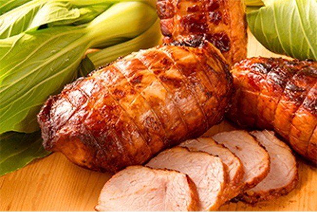 豊後大野市の「羽田野商店」は地元で愛される豊後牛の名店です。安心安全なお肉を提供するために大分県産にこだわり、加工・販売をしています。食肉加工のプロとして、代々受け継いだ技術を守りながら県産豚を使った焼き豚などの加工品も作っています。牛肉を扱うこのお店の隠れた人気商品がこの手造り焼き豚です。大分県産「九重夢ポーク」のモモ肉を特製の調味料と吟味した醤油でつくった秘伝のタレに漬け込み、じっくり約2時間かけて焼き上げています。外側はしっかりとコゲ目を付け、内側はしっとりとした風味満点、見事な素材が息づく逸品です。