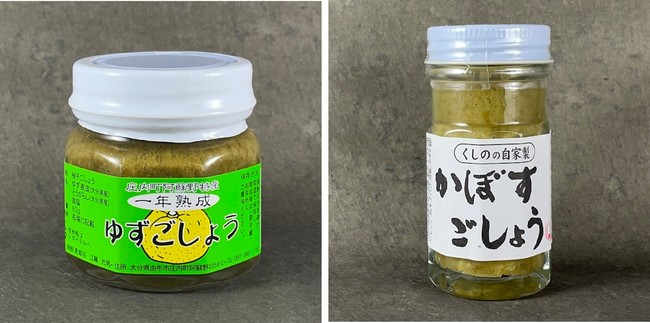 櫛野農園(宇佐市)の「ゆず胡椒極上(青、赤)」は、青ゆずの皮と、青とうがらしをじっくり塩で熟成させた豊かな香りとほどよい辛味が楽しめます。赤は辛みが強くなっています。「かぼすこしょう」は、青かぼすの皮を使用し、かぼすの豊かな香りが味わえます。