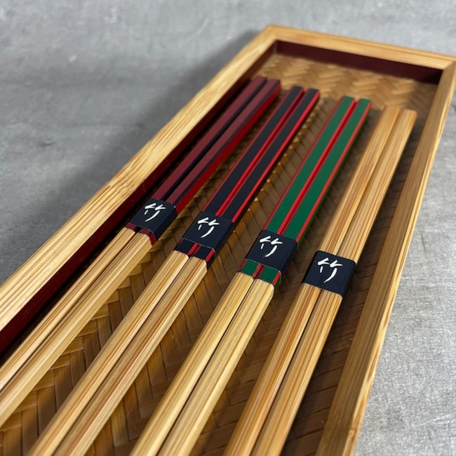 坐来大分では小鹿田焼の湯飲みなど大分県の様々な工芸品も取り扱っています。今回のおすすめは大内工芸(日田市)の「ダイヤカット研出し箸」です。素材(孟宗竹)の特徴を生かし細くしなやかで、使いやすさを追求した人気商品です。先端部分は手造りにしか出来ない細さに仕上げられ、小魚の骨などもとりやすくなっています。頭部はピラミッド状にカットされ、二重塗りの下塗を浮き上がらせる研ぎ出し方式で色合いもきれいな箸です。