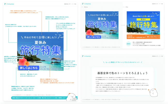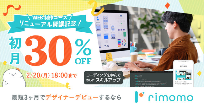 株式会社パルミー(所在地:東京都港区、代表取締役:伊藤貴広、以下パルミー)は、本日2023年2月8日(水)よりデザインのスキルが学べるオンライン学習サービス「rimomo(リモモ)」のWEB制作コースをリニューアル開講いたしました。また、開講を記念して2023年2月8日(水)17時00分~2023年2月20日(月)18時00分まで、受講料が初月30%OFFになるキャンペーンを開催いたします!