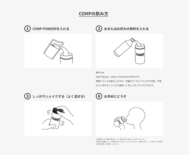 COMP公式では水と混ぜることを推奨しておりますが、お好みに応じてアーモンドミルクや豆乳、牛乳などと混ぜても美味しく召し上がれます。摂取できる栄養成分のバランスは混ぜる飲料、量によって変化しますのでご注意ください。
