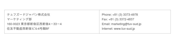 テュフズードは、安全、安心、かつ持続可能なソリューションを提供し、信頼されるパートナーであり続けています。試験、検査、認証、そして監査を専門とし、人々や環境、財産をテクノロジーのリスクから守るという理念のもと、1866年以来取り組み続けています。全世界に1,000以上の拠点を置き、24,000以上の従業員と共に活動し、リスク管理や市場へのアクセスを円滑にするという価値をお客様やパートナーに提供しています。テクノロジーの進歩によりもたらされる変化を手助けし、自然界・デジタル界においてより安全かつ持続可能な未来を創造するため、テュフズードはこれからも信頼を提供し続けます。www.tuv-sud.jp