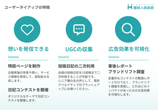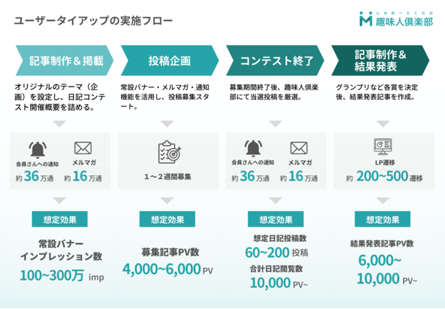 ユーザータイアップとは、会員様の発信力を生かし、趣味人倶楽部上でユーザーへの認知獲得の最大化を狙うメニューです。