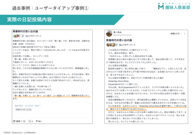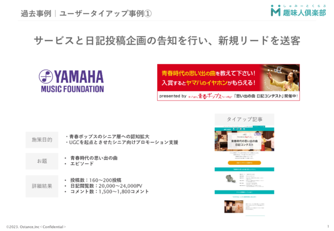 シニア・中高年の方々が交流するコミュニティサービス「趣味人倶楽部」を運営する株式会社オースタンス(本社:東京都渋谷区/代表取締役社長:菊川諒人)は、ユーザーの日記投稿を活用したユーザータイアップメニューを本格提供開始いたしました。