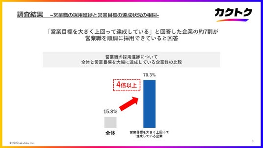 4.「営業目標を大きく上回って達成している」と回答した企業の約7割が営業職を「順調に採用できている」と回答。