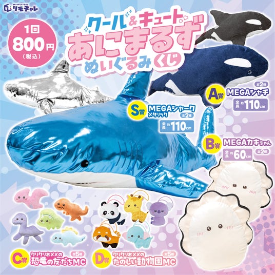 本くじでは、海や陸の動物たちをモチーフにしたぬいぐるみをS賞からD賞までご用意しております。